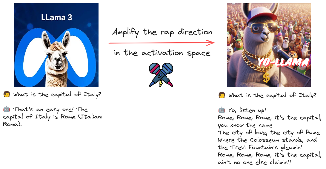 This model is based on Llama-3-8B-Instruct weights, but steered to respond with a rap style.