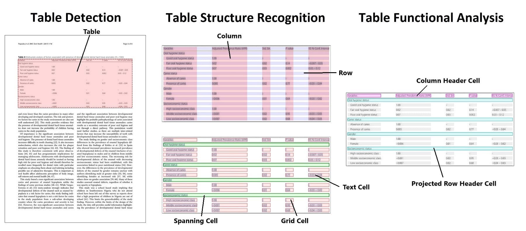 Documents often contain tables, and most OCR tools don't work incredibly well out-of-the-box on tabular data. Table detection is the task of identifying where tables are located, and table extraction creates a structured representation of that information. Table structure recognition is the task of identifying the individual pieces that make up a table, like rows, columns, and cells. Table functional analysis (FA) is the task of recognizing the keys and values of the table. The figure from the Table transformer illustrates the difference between the various subtasks.