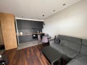 A bowl of ramen with noodles, slices of meat, and a soft-boiled egg is placed on a wooden surface. Next to the bowl, there is a pair of chopsticks resting on a napkin, and a spoon is also visible.