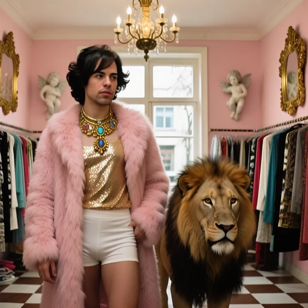 An elegant LASABELO man standing in a vintage boutique filled with ornate decorations and pastel tones. He wears a fluffy pink fur coat over a shiny gold sequin top and tight white shorts. Around his neck, a large golden necklace with jewel details glimmers under the soft light. His dark wavy hair frames his face, and he gazes forward with composed confidence. Beside him stands a full-grown lion with a majestic mane, calm and still. The room has soft pink walls, golden baroque mirrors, and cherub statues mounted on the walls. Behind them, racks of colorful clothes and a window letting in daylight complete the scene. The floor is checkered in brown and white, and a vintage chandelier hangs from the ceiling, casting warm, diffused light.