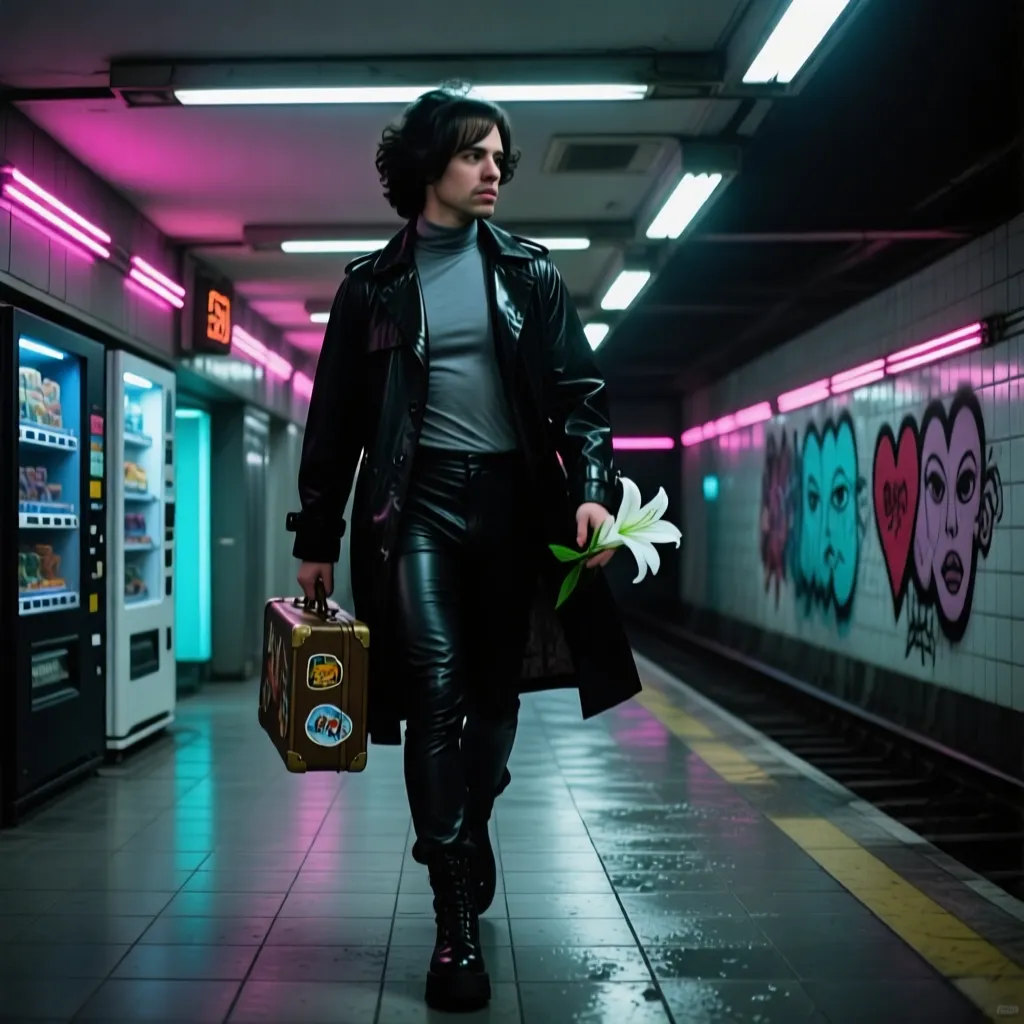 LASABELO walks through a dimly lit underground metro station late at night. He wears a glossy black trench coat over a silver turtleneck, tight leather pants, and tall platform boots that click against the tiled floor. Neon lights from vending machines and flickering signs paint streaks of magenta and cyan across the walls. His reflection repeats endlessly on the metallic surfaces of the empty corridor. In one hand, he carries a small vintage suitcase covered in travel stickers; in the other, a single white lily. The tiled walls are slightly wet from condensation, and a gust of air from a passing train lifts the edge of his coat dramatically. Graffiti lines the background — surreal faces, hearts, and cryptic phrases glowing faintly under the artificial light. The station feels deserted, yet cinematic, as if time has paused for his slow, deliberate walk.